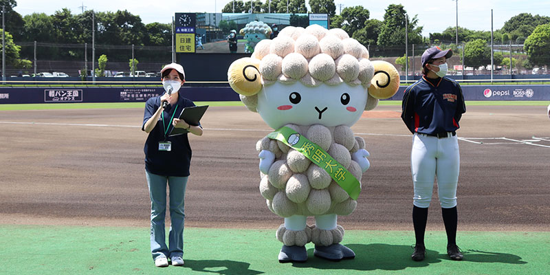 試合開始前には、学生とマスコットキャラクター「メイ」がグラウンドから秀明大学をPR。その後、秀明大学学校教師学部附属秀明八千代高等学校女子硬式野球部の選手が始球式を行いました。