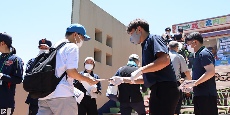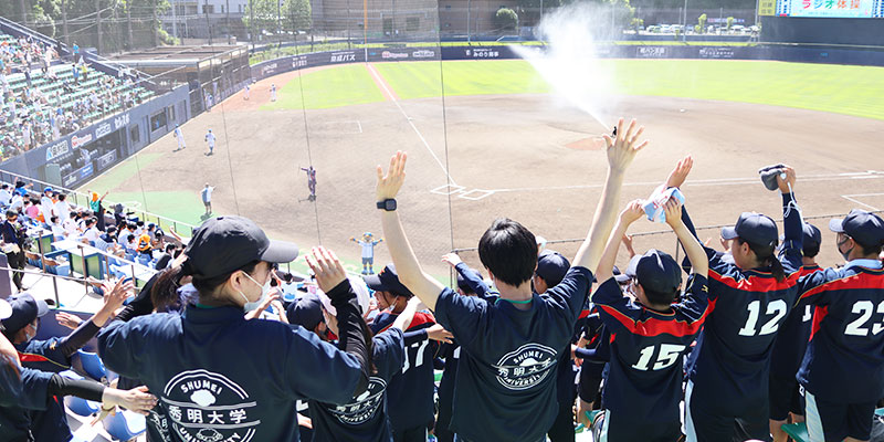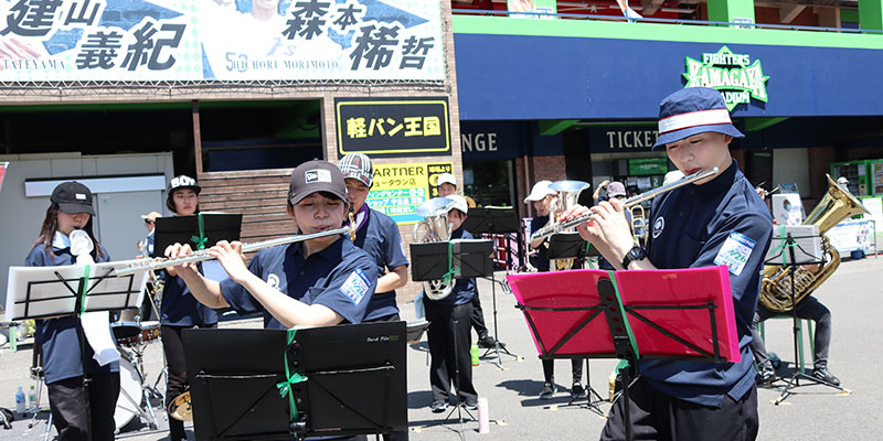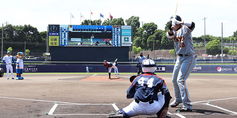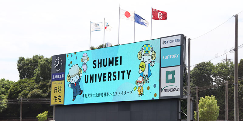 本学の地元八千代市のお隣、鎌ケ谷市にあるプロ野球・北海道日本ハムファイターズ鎌ケ谷スタジアム。6月26日のイースタン・リーグ公式戦(読売ジャイアンツ戦)は、鎌スタ☆スペシャルイベント「秀明大学デー」として開催され、秀明大学や2023年4月に創部される女子硬式野球部のPR活動を行いました。