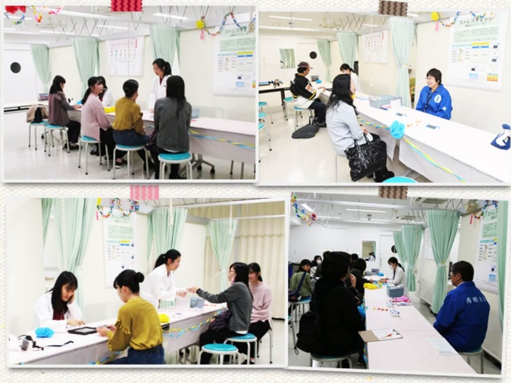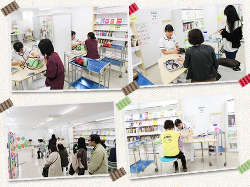 来場者の方にもご自分の血管音を聞いて頂ける聴診器を用意し、血圧測定等を行いました。学生達は、正確な測定に向けて事前練習を積み重ね、当日は笑顔を絶やさず対応。来場者の方から「血管音を初めて聞けて貴重な体験となった」「学生さんのわかりやすく丁寧な説明が良かった」「将来素敵な看護師さんになると思います」など嬉しいお言葉をいただきました。