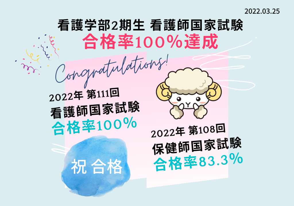 看護師国家試験合格率 100%達成 看護学部 2022年3月25日2022年11月24日 2022年3月卒業の看護学部2期生は、34人全員が看護師国家試験に合格、保健師課程を履修した18人中15人が保健師国家試験に合格しました。 国家試験対策・合格実績 就職支援・実績 投稿ナビゲーション PREVNEXT お知らせ一覧