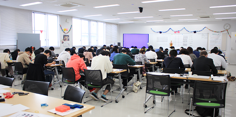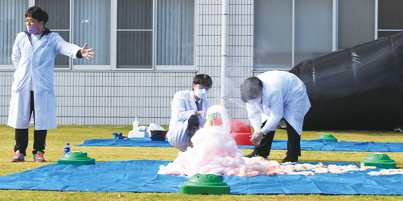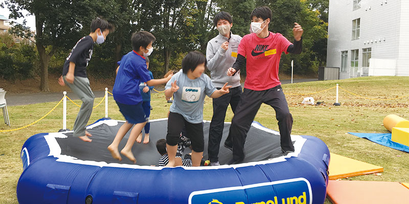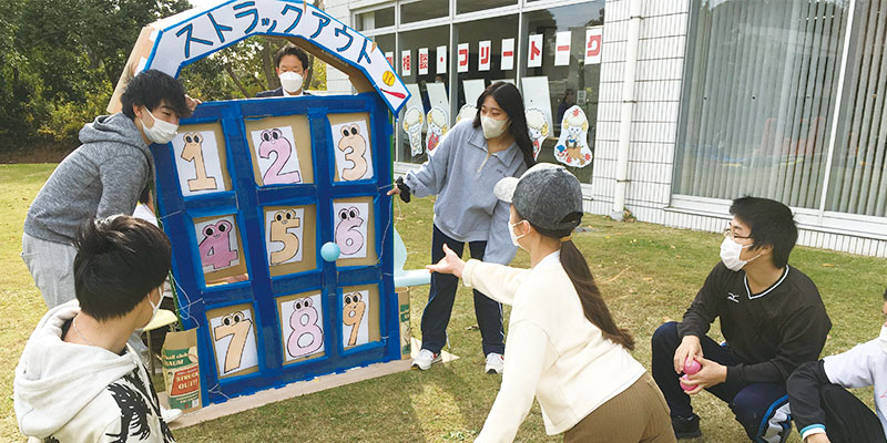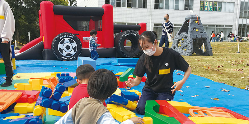 毎年子供たちに大好評の秀明キッズ・パーク。教師を目指している学生が遊具ごとに面倒を見て安全面に配慮しており、たくさんの親子連れで賑わいました。他にも手作りおもちゃで遊ぶ企画、ストラックアウト、環境科学サークルによるイベントなども開催され、瓶から巨大な泡があふれ出す実験では大きな拍手が沸き起こりました。