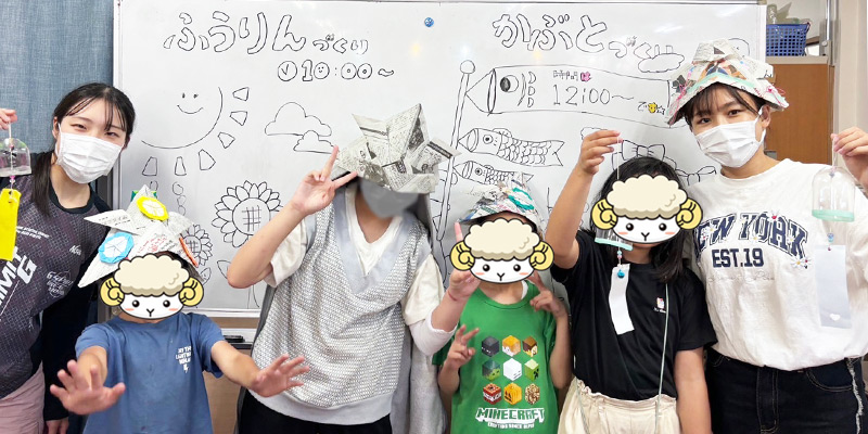 LIBERTEの学生たちは、事前に準備した材料を使って、子どもたちに風鈴と兜の作り方を丁寧に説明。子どもたちは、サポートを受けながら、思い思いのデザインの風鈴と兜を作成しました。