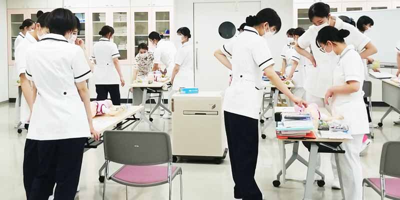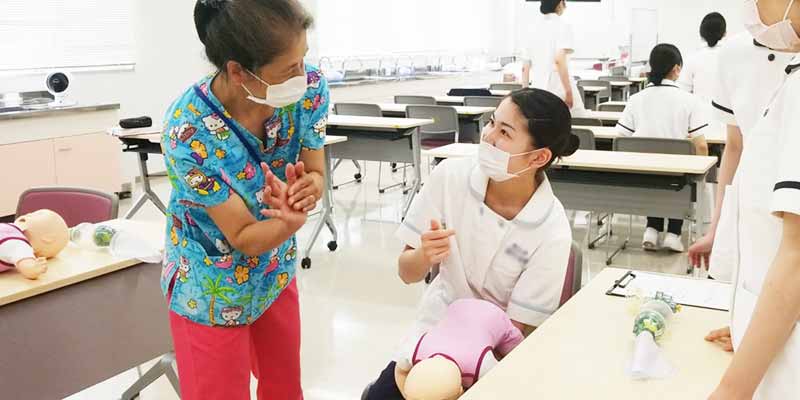看護学部3年生前期の必修科目「小児看護の方法Ⅱ」では、子どもと家族への看護実践を学びます。今回の演習内容は「子どもの救急蘇生」です。乳児期と学童期の子どもを対象に、気道異物の除去や心肺蘇生を実施しました。
