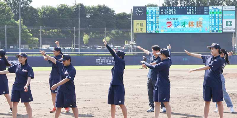 試合の途中、スタジアム演出として来場者全員ラジオ体操や、学生が企画・制作した本学女子硬式野球部の動画をスコアボードにて放映しました。