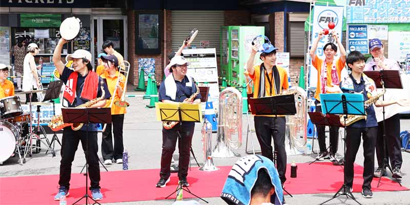 広報サポーターの学生はPRブースで、じゃんけん大会を行いオリジナルグッズをプレゼント。本学と附属高校の吹奏楽部によるミニコンサートや応援歌の演奏などで球場をさらに盛り上げました。