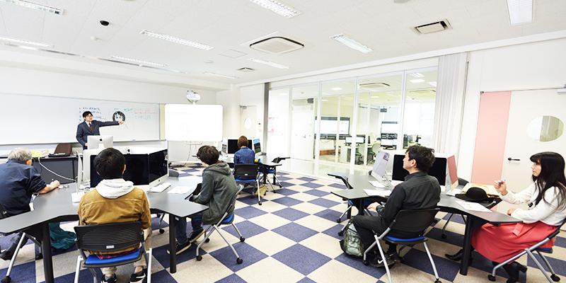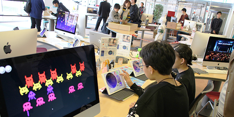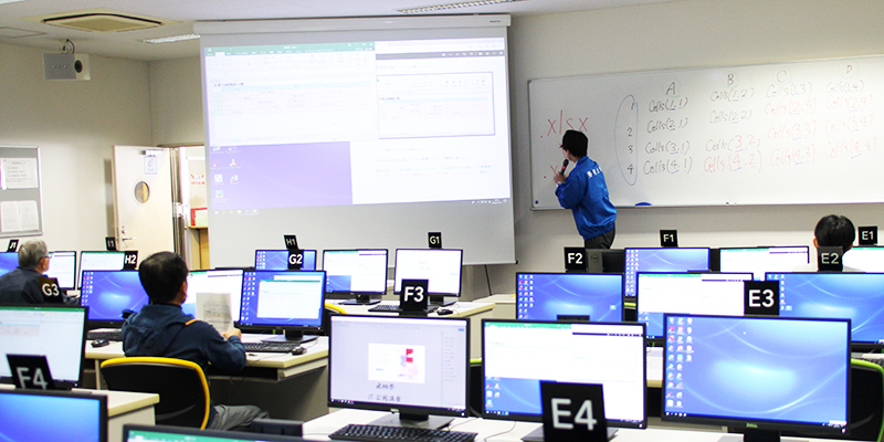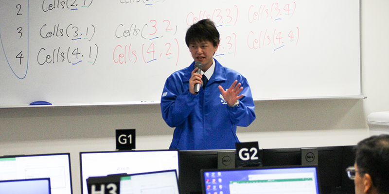 MicrosoftOfficeエクセルのマクロ機能やVBAを使用したプログラミング作成を行い、その難しさと便利さを体験していただきました。入門レベルの難易度で小さなアプリケーション作成を体験。初心者や小・中学生の受講者にも、松山ゼミの学生が丁寧にフォローを行い、プログラミングの楽しさ大切さを楽しく学ぶことができました。