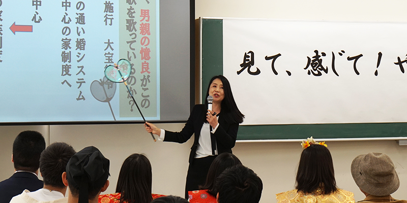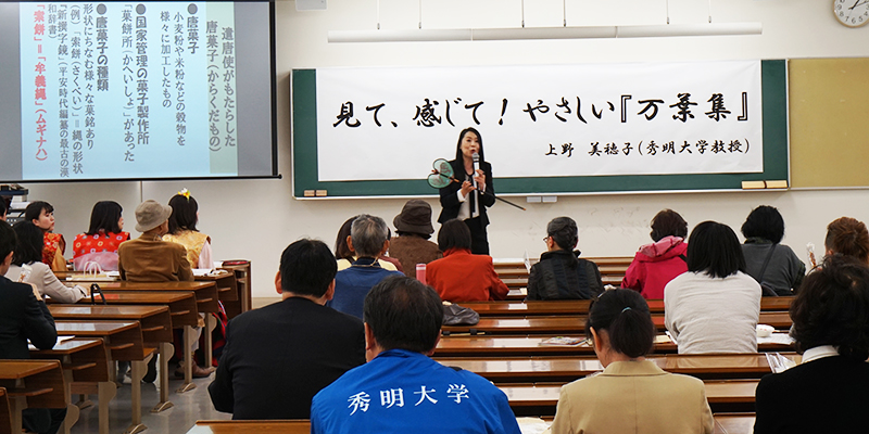 本学学校教師学部の上野美穂子教授により、万葉集に収められた和歌から見た当時の「食・ファッション」「占い・まじない」「恋」について、歌や劇を交えた楽しい講演が行われました。防人歌から見る万葉集と千葉の関係や現在(令和)と奈良時代を自由自在に行き来する興味深い解説に受講者の方たちも興味深く聞き入っていました。また、受講者には萬葉みくじが配られ、講演内で解説した和歌が書いてあるおみくじをお持ちの方に、万葉集にちなんだ銘菓が謹呈されました。