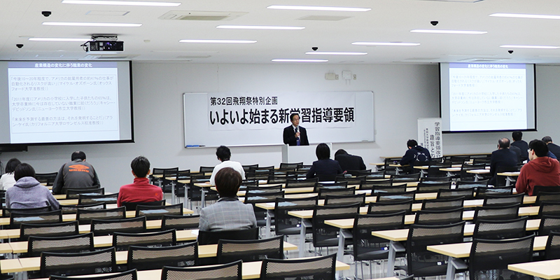 本学教育研究所顧問で前文部科学省主任視学官の清原洋一教授から、新学習指導要領の趣旨やねらいについての講演が行われました。続いて、“主体的に学ぶ力を伸ばす指導”の研究に取り組んでいる習志野市立第三中学校の三橋直行先生の実践報告が行われ、シンポジウムからは、千葉県教育委員会学習指導課教育課程室長の谷口哲也先生にもご参加いただき、これからの学校における日々の授業の在り方などについて参会の皆さんとともに討論しました。