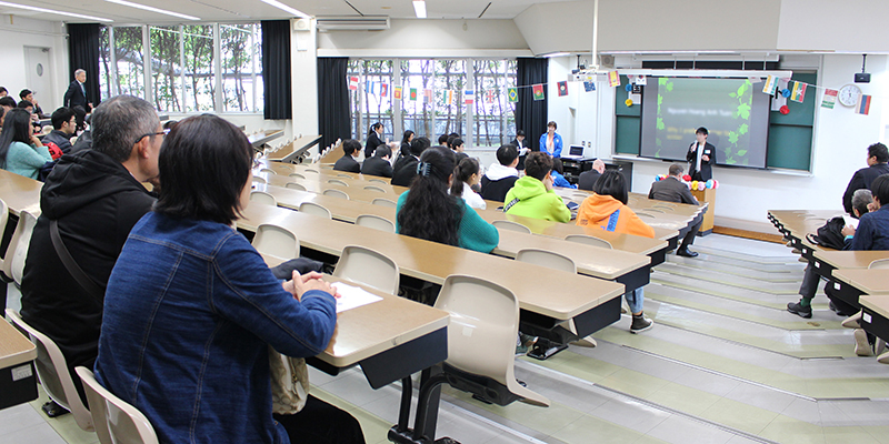 今年は、イギリス出身のアンソニー・セリック、ジェームズ・ベリーの両准教授がそれぞれ “How is the weather?” “Weird and wonderful accommodation around the world”というテーマで、初心者の方も楽しめるよう工夫された講座が行われ、講座終了後、受講者の方々はイングリッシュティーを飲みながら英会話を楽しむ優雅なひと時を過ごされました。