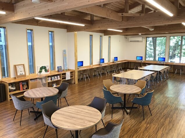 2020年4月、図書館本館横に森の図書館をイメージしたカフェテリアが完成しました。